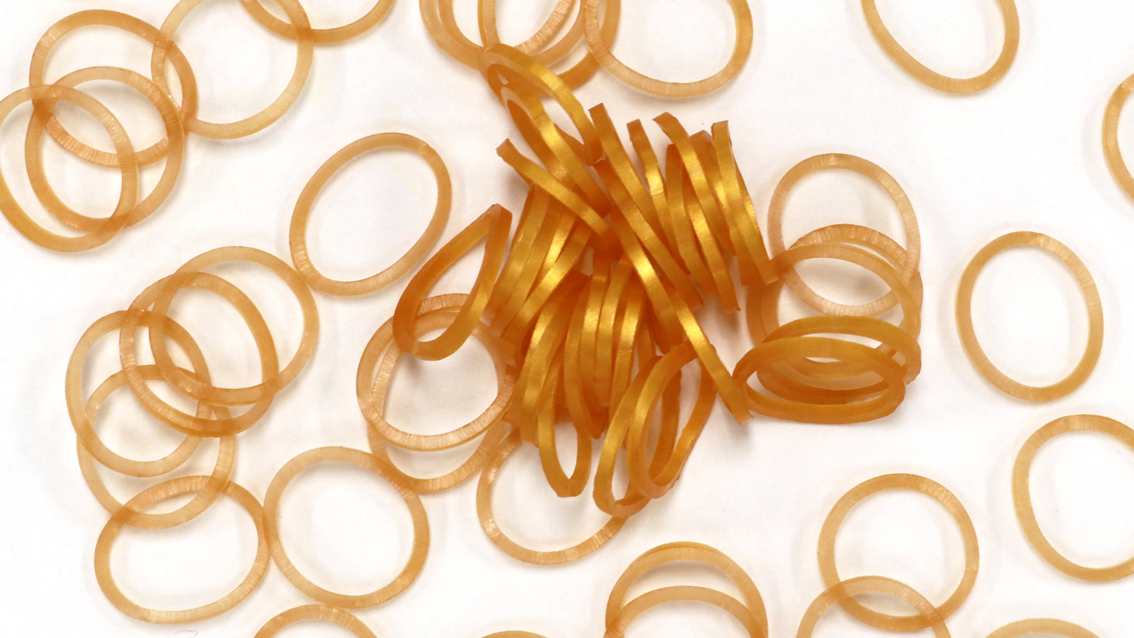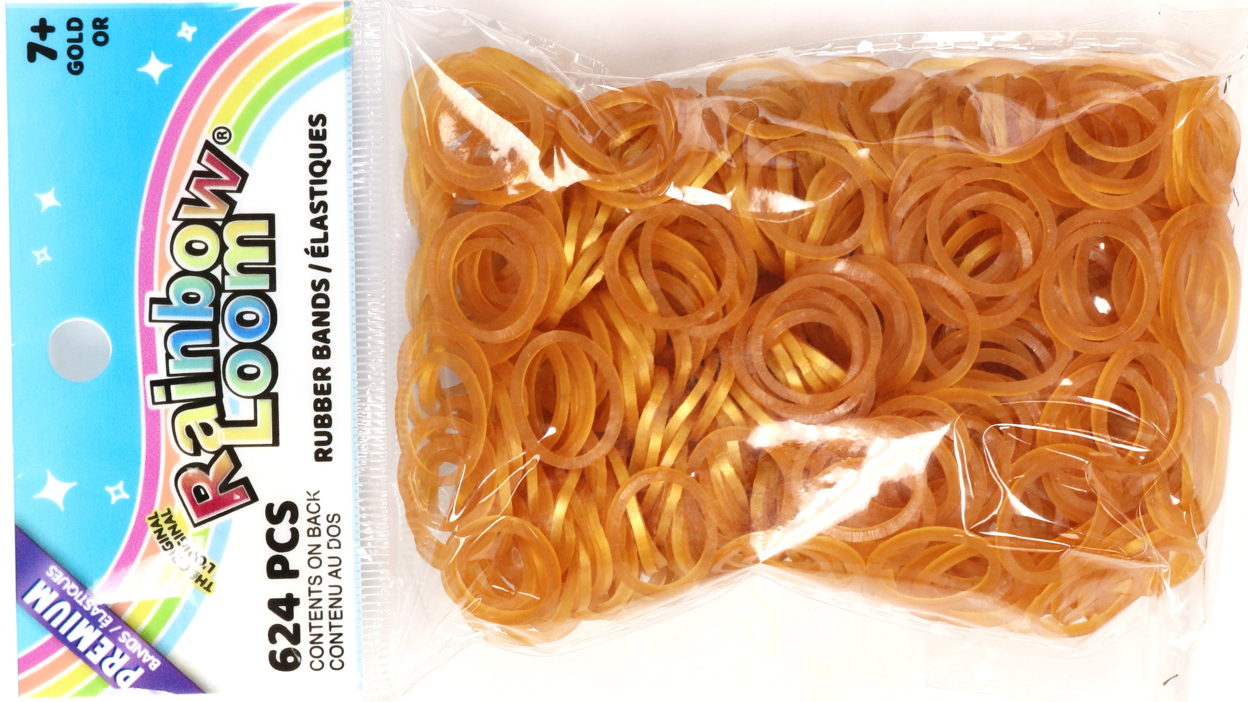 Semi-transparent metallic gold color, 600+ non-latex*** rubber bands & a bag of 24 C-clips.