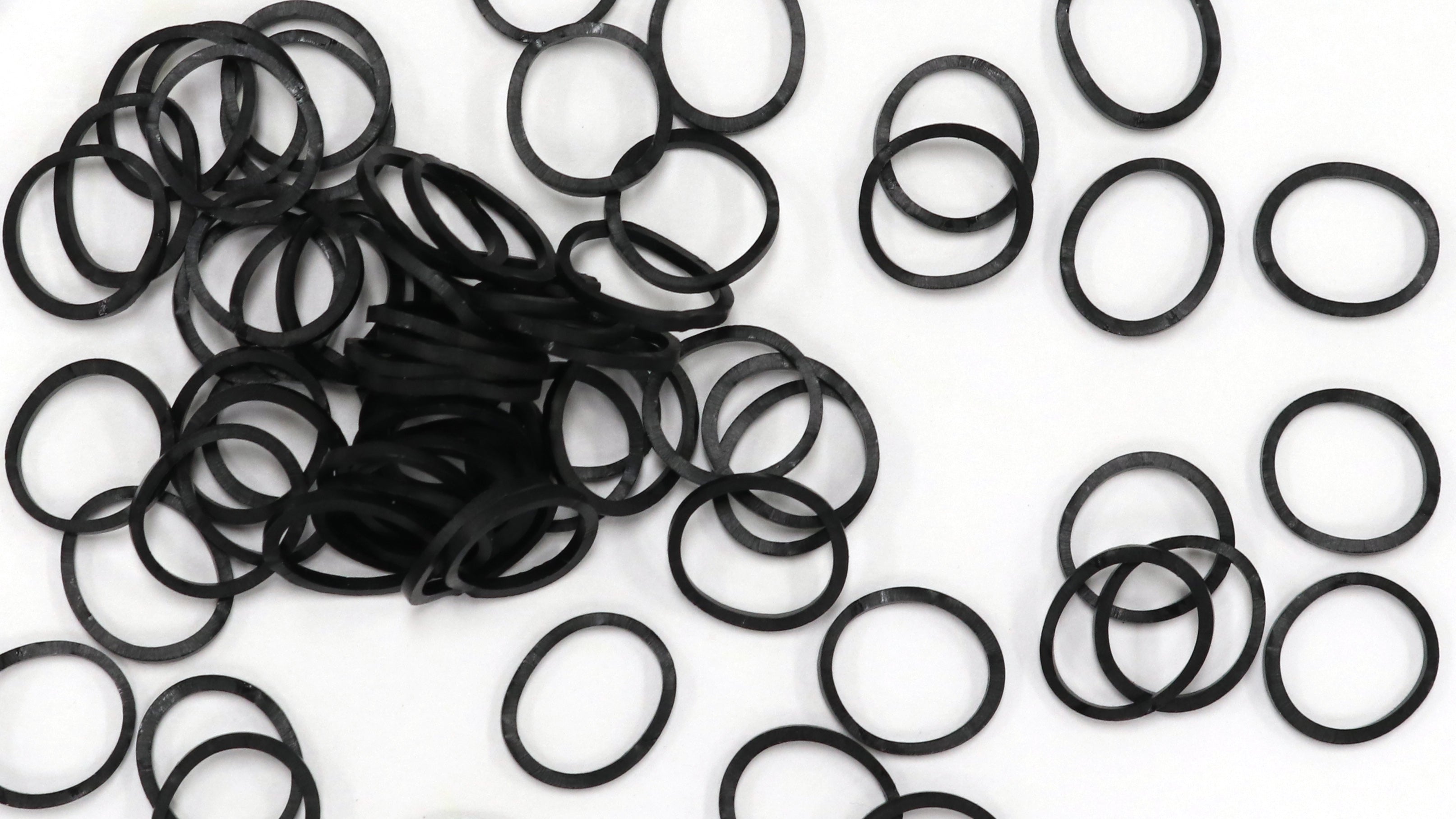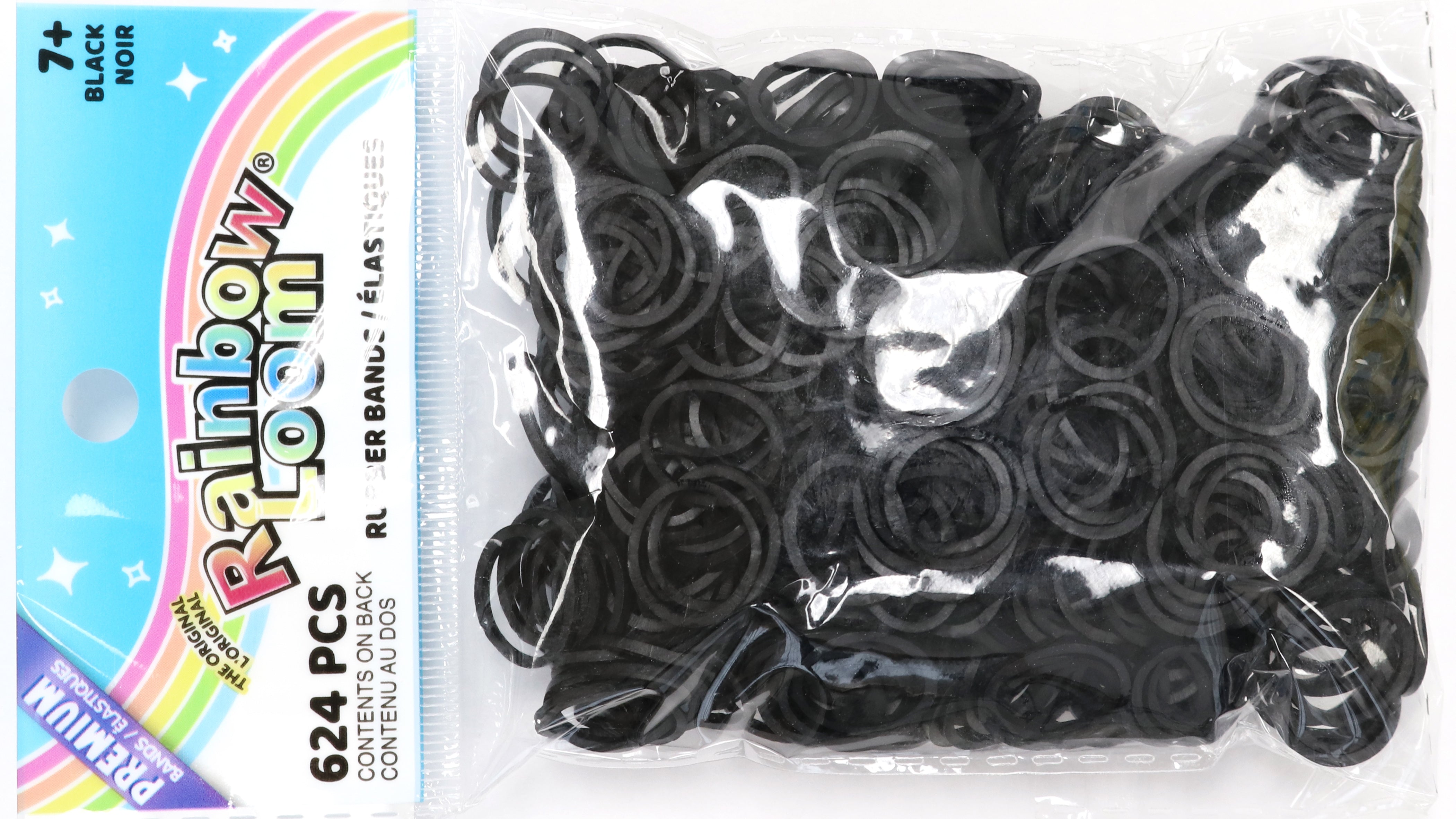 Opaque black color, 600+ non-latex*** rubber bands & a bag of 24 C-clips.