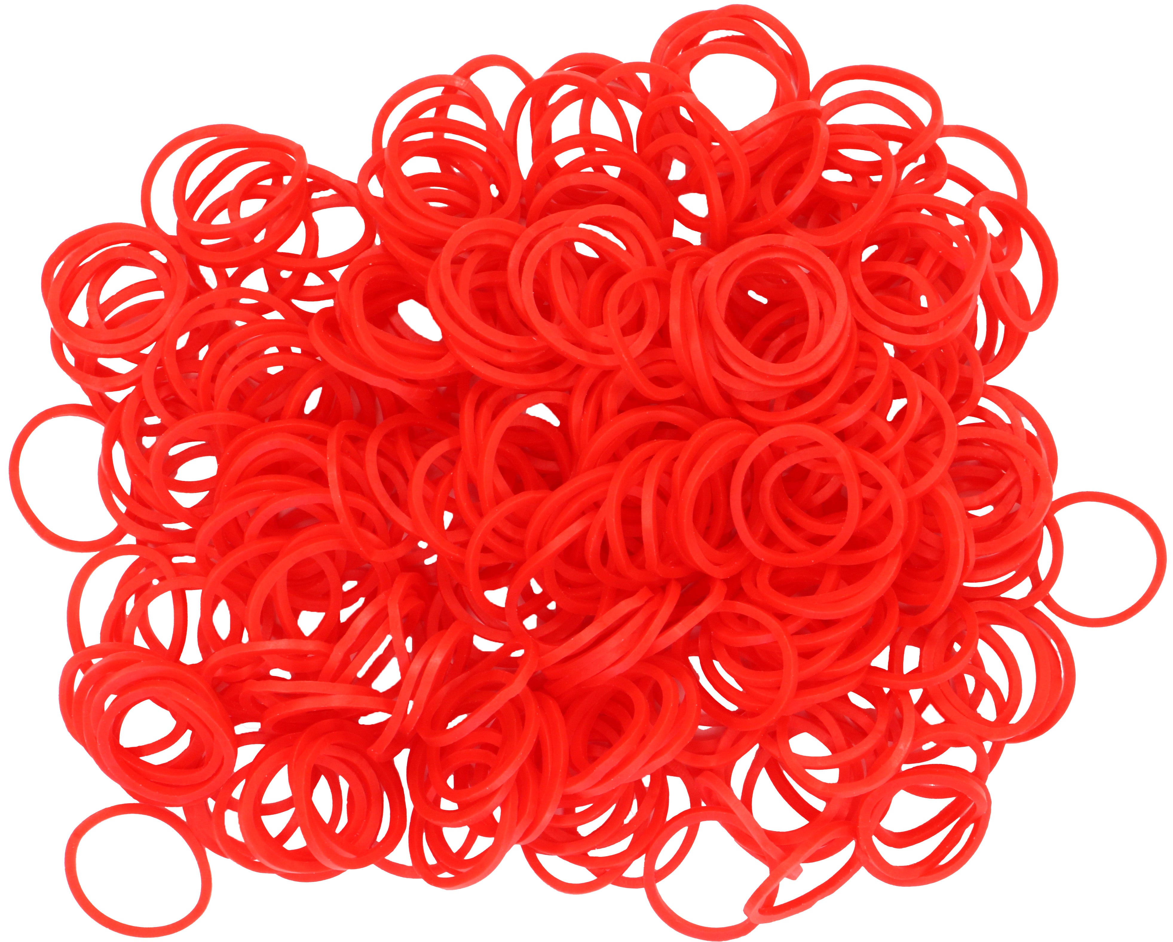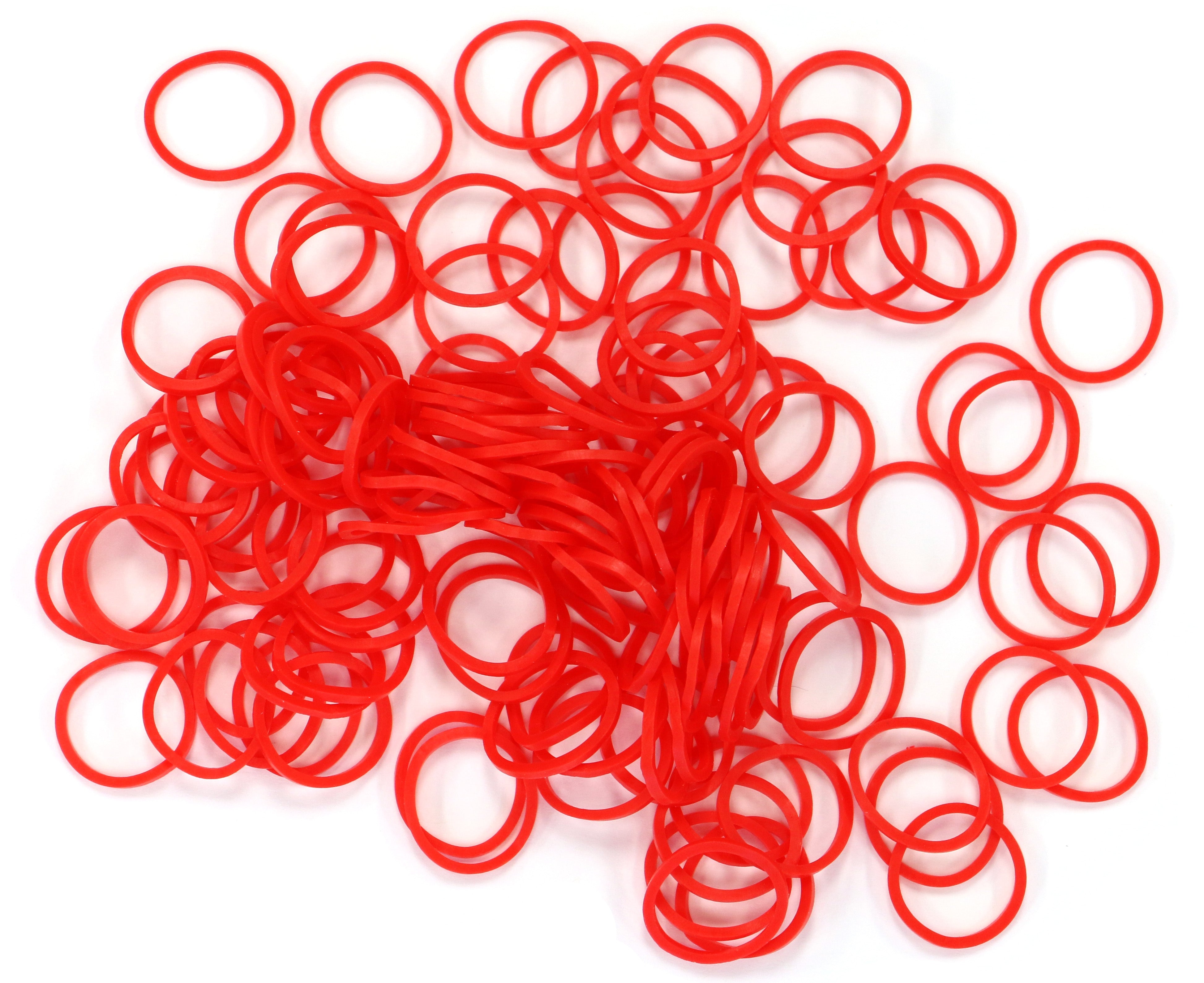 Opaque pinkish red color, 600+ non-latex*** rubber bands & a bag of 24 C-clips.